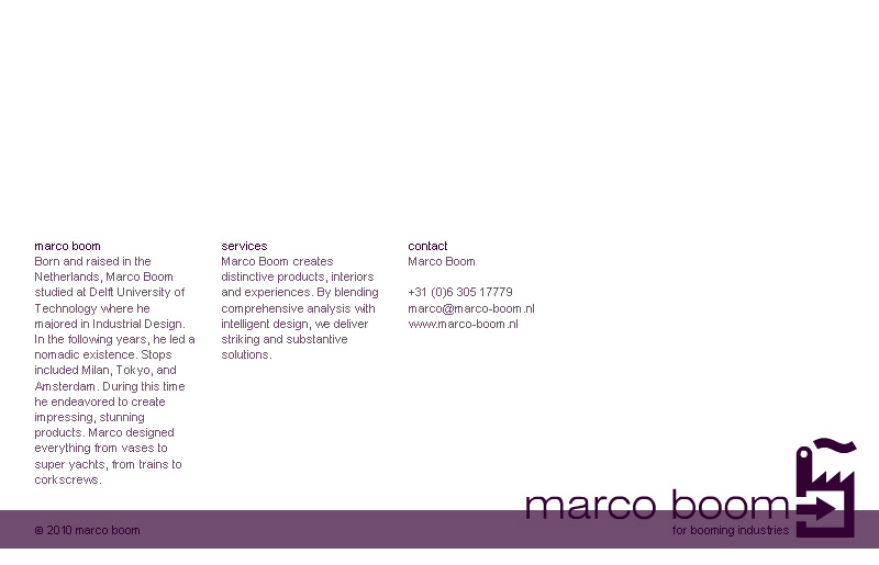 Born and raised in the Netherlands, Marco Boom studied at Delft University of Technology where he majored in Industrial Design. In the following years, he led a nomadic existence. Stops included Milan, Tokyo, and Amsterdam. During this time he endeavored to create impressing, stunning products. Marco designed everything from vases to super yachts, from trains to corkscrews. |