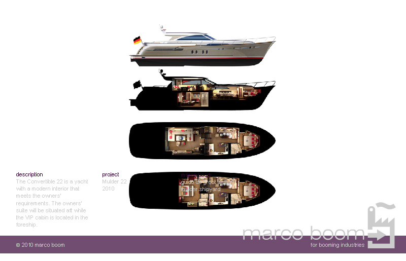 The Convertible 22 is a yacht with a modern interior that meets the owners’ requirements. The owners’ suite will be situated aft while the VIP cabin is located in the foreship. |