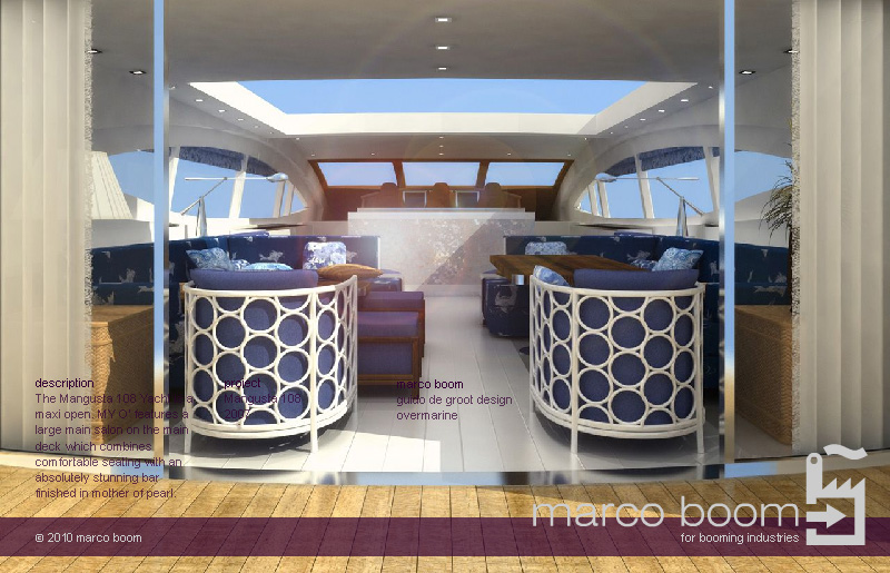 The Mangusta 108 Yacht is a maxi open. MY O’ features a large main salon on the main deck which combines comfortable seating with an absolutely stunning bar finished in mother of pearl. |